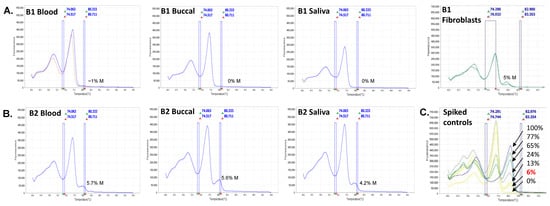 Derivative curve high-resolution melt profiles and mean methylation output ratios of CpG sites located within the Fragile X-Related Epigenetic Element 2 (FREE2) region assessed using Methylation-Specific Quantitative Melt Analysis (MS-QMA) between different tissues for (A) B1 and (B) B2. (C) DNA samples from lymphoblasts of a fragile X syndrome (FXS) male with the fragile X mental retardation 1 (FMR1) promoter 100% methylated spiked with DNA from a typically developing control (cytosine-guanine-guanine (CGG) < 44) with the FMR1 promoter 0% methylated. These samples were mixed at different ratios for the MS-QMA methylation reference curve, with the expected % of methylation indicated on the plot for each derivative curve profile.