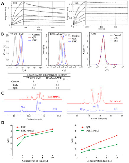 4.7.2. Influence of Binding Affinity of ESK, Q2L, and ESK-1G4 after Sortase A-Mediated Conjugation on K562-A2-WT1126–134 Cell Line