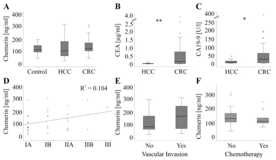 Chemerin did not correlate with AFP (r = −0.20, p = 0.22), CEA (r = 0.08, p = 0.57) and CA19-9 (r = 0.15, p = 0.31) in the cancer patients of the whole cohort and when both groups were analyzed separately (CRC: AFP r = −0.08, p = 0.77, CEA r = 0.18, p = 0.34 and CA19-9 r = 0.31, p = 0.09; HCC: AFP r = −0.15 p = 0.48, CEA r = −0.19, p = 0.41 and CA19-9 r = −0.42, p = 0.07 ). In the HCC group chemerin was not associated with tumor size (r = 0.271, p = 0.13), grade (r = 0.044, p = 0.82) or tumor-node-metastasis (TNM) stage (Figure 1D). Patients without vascular invasion had serum chemerin similar to those with this development (Figure 1E).