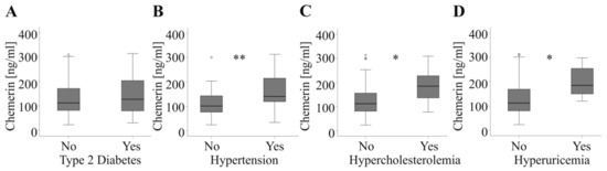2.3. Association of Chemerin with Type 2 Diabetes, Hypertension, Hypercholesterolemia and Hyperuricemia