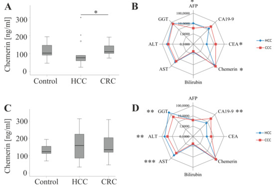 Serum chemerin and comorbidities. (A) Chemerin in 27 controls, 14 HCC and 18 CRC patients not suffering from hypertension, hypercholesterolemia or hyperuricemia. (B) Spider diagram presentation of chemerin, carcinoembryonic antigen (CEA), cancer antigen 19-9 (CA19-9), alpha-fetoprotein (AFP), γ-glutamyltransferase (GGT), alanine aminotransferase (ALT), aspartate aminotransferase (AST) and bilirubin in the serum of HCC and CRC patients described in A. The spider diagram shows the respective median values on a logarithmic scale. (C) Chemerin in 22 controls, 18 HCC and 18 CRC patients suffering from hypertension, hypercholesterolemia or hyperuricemia. (D) Spider diagram presentation of chemerin, CEA, CA19-9, AFP, GGT, ALT, AST and bilirubin in the serum of HCC and CRC patients described in C. The spider diagram shows the respective median values on a logarithmic scale. * p < 0.05, ** p < 0.01, *** p < 0.001.