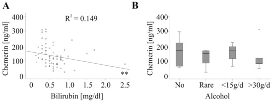 Serum chemerin, bilirubin and alcohol. (A) Correlation of chemerin with bilirubin in 31 HCC and 35 CRC patients. (B) Chemerin in HCC patients stratified for alcohol intake (No alcohol: 11 patients; Rare: 5 patients; <15 g/d: 3 patients; > 30 g/d 5 patients). ** p < 0.01.
