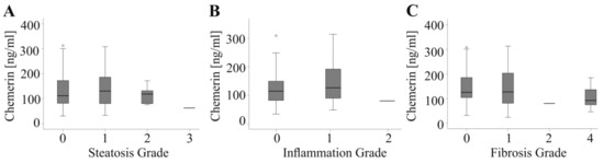 In line with this suggestion, serum chemerin was not changed in non-alcoholic fatty liver disease (NAFLD) patients with increasing steatosis, inflammation and fibrosis grades [44]. A separate study identified a trend to raised serum chemerin in morbidly obese NAFLD patients with a higher degree of liver steatosis [45]. In a similar patient cohort elevated chemerin was reported in patients with portal inflammation and fibrosis [46]. In chronic hepatitis C serum chemerin was even negatively correlated with necro-inflammatory grade [19].