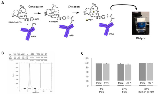 - Perk, L.R.; Vosjan, M.J.; Visser, G.W.; Budde, M.; Jurek, P.; Kiefer, G.E.; van Dongen, G.A. p-Isothiocyanatobenzyl-desferrioxamine: A new bifunctional chelate for facile radiolabeling of monoclonal antibodies with zirconium-89 for immuno-PET imaging. Eur. J. Nucl. Med. Mol. Imaging 2010, 37, 250–259. [Google Scholar] [CrossRef] [PubMed]