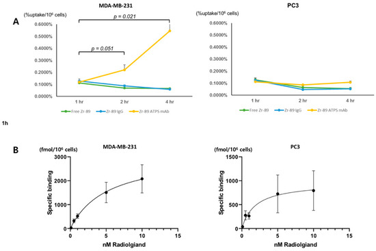The cellular uptake of Zr-89 ATPS mAb was measured in MDA-MB-231 and PC3 cells and presented as the percentage of the radioactivity added per 106 cells (Figure 2A). For MDA-MB-231 cells, the cellular uptake of Zr-89 ATPS mAb increased over time; 0.103 ± 0.014%/106 cells, 0.266 ± 0.058%/106 cells and 0.556 ± 0.122%/106 cells at 1, 2 and 4 h, respectively. Cellular uptake was significantly higher at 4 h than at 1 h after incubation (p = 0.021). However, cellular uptake of free Zr-89 and Zr-89 IgG did not increase significantly; for free Zr-89, 0.106 ± 0.013%/106 cells, 0.070 ± 0.014%/106 cells and 0.072 ± 0.005%/106 cells at 1, 2 and 4 h, respectively; for Zr-89 IgG, 0.108 ± 0.022%/106 cells, 0.089 ± 0.005%/106 cells and 0.071 ± 0.013%/106 cells at 1, 2 and 4 h, respectively. In contrast, for PC3 cells, cellular uptake of all three radiotracers did not increase with time; for Zr-89 ATPS mAb, 0.112 ± 0.019%/106 cells, 0.086 ± 0.005%/106 cells and 0.108 ± 0.005%/106 cells at 1, 2 and 4 h, respectively; for free Zr-89, 0.129 ± 0.015%/106 cells, 0.064 ± 0.014%/106 cells and 0.056 ± 0.009%/106 cells at 1, 2 and 4 h, respectively; for Zr-89 IgG, 0.124 ± 0.019%/106 cells, 0.047 ± 0.010%/106 cells and 0.053 ± 0.009%/106 cells at 1, 2 and 4 h, respectively.
