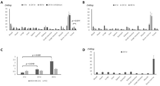The biodistribution of Zr-89 ATPS mAb was performed using mice bearing MDA-MB-231 tumors (Figure 3A) or PC3 tumors (Figure 3B) at 4, 24 and 48 h. Tumor uptake of Zr-89 ATPS mAb in MDA-MB-231 tumors increased with time, although it was not statistically significant at 6.5 ± 2.0% ID/g, 9.4 ± 0.9% ID/g, and 9.0 ± 2.0% ID/g at 4, 24, and 48 h, respectively. Tumor uptake of Zr-89 ATPS mAb in PC3 tumors decreased but was not statistically significant at 24 and 48 h; 6.3 ± 0.1% ID/g, 3.8 ± 0.1% ID/g, and 4.0 ± 0.5% ID/g at 4, 24, and 48 h, respectively. Tumor uptake of Zr-89 ATPS mAb at 24 h was significantly higher for MDA-MB-231 tumors than for PC3 tumors (p = 0.004). Zr-89 ATPS mAb uptake in MDA-MB-231 tumors at 24 h was inhibited by cold ATPS mAb (4.4 ± 0.5% ID/g, p = 0.011). The tumor/blood ratio of Zr-89 ATPS mAb in MDA-MB-231 tumors increased significantly with time, with 0.32 ± 0.09, 0.87 ± 0.13, and 2.24 ± 0.44 at 4, 24, and 48 h, respectively (Figure 3C, p < 0.05). In contrast, the tumor/blood ratio of Zr-89 ATPS mAb in PC3 tumors did not increase with time, with 0.59 ± 0.13, 0.63 ± 0.09, and 0.93 ± 0.13 observed at 4, 24, and 48 h, respectively (p > 0.05). Zr-89 ATPS mAb uptake in the blood was the highest at 4 h and then decreased with time, at 19.8 ± 1.9% ID/g and 4.1 ± 0.3% ID/g at 4 and 48 h, respectively, for MDA-MB-231 tumors, and 11.5 ± 2.0% ID/g and 4.5 ± 0.4% ID/g at 4 and 48 h, respectively for PC3 tumors. Similarly, Zr-89 ATPS mAb uptake in the heart and muscles also reached its peak at 4 h. However, the bone marrow uptake of Zr-89 ATPS mAb increased with time for both tumor models; 13.5 ± 2.0% ID/g, 42.2 ± 3.0% ID/g, and 51.0 ± 7.4% ID/g at 4, 24, and 48 h, respectively, for MDA-MB-231 tumors, and 18.5 ± 3.8% ID/g, 49.9 ± 10.3% ID/g, and 46.4 ± 9.5% ID/g at 4, 24, and 48 h, respectively for PC3 tumors. We also evaluated the biodistribution of Zr-89 oxalate after injection to the wild-type mice (Figure 3D). At 24 h after administration, the bone marrow uptake was 48.4 ± 10.4% ID/g, which was similar to that of Zr-89 ATPS mAb at 24 h.