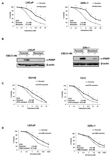 We used two DTX-resistant (DU145-DR, C4-2-DR) [17,18,19] and two CBZ-resistant PCa cell lines (LNCaP-CR, 22Rv-1-CR) [20] to analyze the involvement of TUBB3 in DTX and CBZ resistance. We performed 4,5-dimethylthiazol-2-yl-2,5-diphenyltetrazolium bromide (MTT) assays to measure cell viability under various concentrations of CBZ in parental and CBZ-resistant cells in LNCaP and 22Rv-1 cells. The IC50 values of LNCaP-CR and 22Rv-1-CR cells were significantly higher than those of LNCaP and 22Rv-1 parental cells (Figure 1A). We compared the expression of c-PARP, which was used as an apoptosis marker, in parental and CBZ-resistant cells in LNCaP and 22Rv-1 cells. Western blotting showed that the expression of c-PARP was induced by CBZ treatment in LNCaP and 22Rv-1 parental cells but was not changed by CBZ treatment in LNCaP-CR and 22Rv-1-CR cells (Figure 1B). Recent studies have reported cross-resistance between DTX and CBZ in PCa [6,7]. MTT assays were performed to measure cell viability under various concentrations of CBZ in DTX-resistant cells and parental cells in DU145 and C4-2 cell lines. The IC50 values of DTX-resistant cells were significantly higher than those of parental cells in DU145 and C4-2 cells (Figure 1C). Furthermore, MTT assays were performed to measure cell viability under various concentrations of DTX in CBZ-resistant cells and parental cells in LNCaP and 22Rv-1 cell lines. The IC50 values of CBZ-resistant cells were significantly higher than those of parental cells in LNCaP and 22Rv-1 cells (Figure 1D). These results indicate that cross-resistance between DTX and CBZ exists in PCa.
