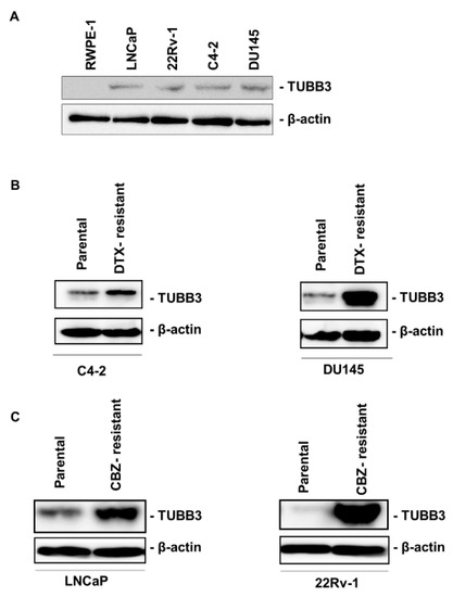 TUBB3 is overexpressed in docetaxel (DTX)-resistant cell lines and cabazitaxel (CBZ)-resistant cell lines. (A) Western blotting of TUBB3 in RWPE-1, LNCaP, 22Rv-1, C4-2 and DU145 cells. β-actin was used as a loading control. (B) Western blotting of TUBB3 in parental and DTX-resistant cell lines in C4-2 and DU145 cells. β-actin was used as a loading control. (C) Western blotting of TUBB3 in parental and CBZ-resistant cell lines in LNCaP and 22Rv-1 cells. β-actin was used as a loading control.