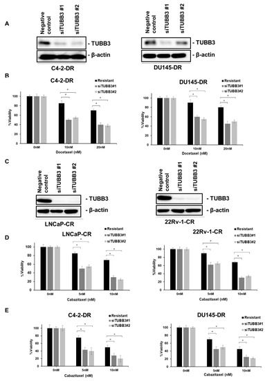 In this study, we use DTX- and CBZ-resistant PCa cell lines to analyze the involvement of TUBB3 in, and the effect of TUBB3 knockdown on, DTX and CBZ resistance in PCa cell lines. We also investigate the effect of LY294002 in these DTX- and CBZ-resistant PCa cell lines.