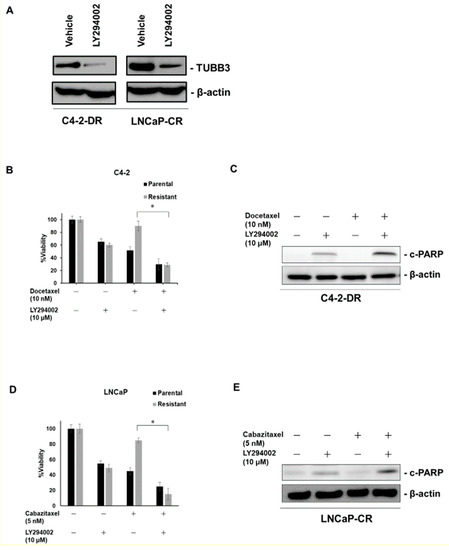 The effect of phosphoinositide 3-kinases (PI3K) inhibitor LY294002 on docetaxel (DTX) and cabazitaxel (CBZ) resistance. (A) Western blotting of TUBB3 in C4-2 DTX-resistant (C4-2-DR) cells and LNCaP CBZ-resistant (LNCaP-CR) cells treated with vehicle (ethanol) and LY294002 (20 µM). β-actin was used as a loading control. (B) The effect of combination therapy with DTX (10 nM) and LY294002 (10 µM) on cell viability in parental and DTX-resistant cell lines in C4-2 cells. The results are expressed as the mean and SD of triplicate measurements. * p < 0.01. (C) Western blotting of c-PARP in DTX-resistant cell lines in C4-2 cells treated with either LY294002 (10 nM) alone or with DTX (10 nM). β-actin was used as a loading control. c-PARP: cleaved PARP. (D) The effect of combination therapy with DTX (10 nM) and LY294002 (10 µM) on cell viability in parental and CBZ-resistant cell lines in LNCaP cells. The results are expressed as the mean and SD of triplicate measurements. * p < 0.01. (E) Western blotting of c-PARP in CBZ-resistant cell lines in LNCaP cells treated with either LY294002 (10 nM) alone or with CBZ (5 nM). β-actin was used as a loading control.