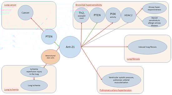 It is well established that miRNAs are pleiotropic molecules involved in almost all major biological processes. This concept was particularly studied in the lung, where specific miRNAs demonstrated to cooperate with organ development and pulmonary diseases. During the last years, much data has been collected on this topic, with special regards to obstructive and restrictive lung diseases [91,92,93]. In fact, as Sessa and Hata [94] reported, a typical miRNAs expression profile was noticed and different miRNAs play an active role among different processes including hemostasis, viral infection, and inflammation. Lung-specific miRNAs can be used as novel biomarkers in lung disorders. To date, several pieces of research focused on specific lung disease miRNAs expression patterns. However, specific miRNAs expression profiles may be noticed also among different organs. Previously, Wang et al. [20] conducted a study on rats, demonstrating that two specific miRNAs (miR-195 and miR-200c) were peculiarly expressed in the lung, while eight miRNAs were co-expressed in the lung and heart and one miRNA was co-expressed in the lung and kidney. As interest increased on this topic, accessible databases as, for example, MiRmine were created in order to allow researchers to retrieve expression profiles of single or multiple miRNAs for a specific tissue or cell line, either normal or with disease information [95]. According to our results, miR-21 seems to be the most represented miRNA among lung conditions. MiR-21 is often up-regulated in lung carcinoma. This fact is believed to be a result of the capacity of miR-21 to inhibit tumor suppressor phosphatase and tensin-homolog [96]. Collison et al. [24] characterized miRNAs expression among house dust mite allergic mice. A group was treated with antagomiRs that inhibited the function of specific miRNAs in the lung, and the other group received standard steroid therapy with dexamethasone. Finally, inflammatory lesions and airway hyper-responsiveness were measured. Researchers found that, although miR-21 and let-7b were highly expressed during allergic inflammation, blockade of their function was ineffective at modulating the expression of disease. On the other hand, Kim et al. [27] conducted a study on BALB/c mice noticing that antagomiR-21 increased phosphatase and tensin homolog (PTEN) levels (p < 0.05). Treatment with Ant-21 reduced phosphoinositide 3-kinase (PI3K) activity and restored histone deacetylase (HDAC2) levels (p < 0.05), leading to suppression of airway hyper-responsiveness and to restore of steroid sensitivity to allergic airway disease. Lee et al. [60] also investigated allergic inflammation among mouse models, reporting that MiR-21 expression was down-regulated in mice lungs treated with anti-miR-21. In fact, specific antagomiR reduced both eosinophil count (p < 0.01) and Th2 cytokines levels, including IL-5 and IL-13 in mice BAL fluid (p < 0.05). MiRNA21 demonstrated positive effects also upon lung ischemia. Ischemia/reperfusion injury (IRI) is the primary cause of acute lung injury (ALI) and primary graft dysfunction (PGD) after lung transplantation [97]. Li et al. [28] conducted a study on murine lung ischemia/reperfusion (I/R) and in vitro hypoxia/reoxygenation (H/R) models demonstrating that pre-treatment of mesenchymal stromal cells with miR-21-5p antagomiR ameliorated IRI in the lung. Regarding PAH, Pullamsetti et al. [25] conducted a study both on animal models and cell lines demonstrating that Ant-17 and Ant-21 reduced right ventricular systolic pressure and pulmonary arterial muscularization. Moreover, Ant-17 decreased hypoxia-induced right ventricular hypertrophy and improved pulmonary artery acceleration time. In mice, Ant-17 therapy reduced right ventricular systolic pressure and total pulmonary vascular resistance index, stabilized cardiac output and reduced pulmonary vascular remodeling. In human pulmonary artery smooth muscle cells, Ant-17 increased the cyclin-dependent kinase inhibitor 1A (p21). MiRNA 21 demonstrated to have a role also upon lung fibrosis. In fact, Shentu et al. [26] demonstrated that human mesenchymal stem cell-derived extracellular vesicles (mEVs) do contain several specific miRNAs including 21-5p and 630. MEVs suppress TGFβ1-induced myofibroblastic differentiation of normal and idiopathic pulmonary fibrosis (IPF) lung fibroblasts, thus mitigating tissue fibrotic response. Investigating the role of miRNA regarding the pathogenesis and progression of lung fibrosis, Liu et al. [98] found that miR-21 was up-regulated both in the lungs of mice presenting with bleomycin-induced lung fibrosis and IPF patients. In this setting, miR-21 was highly expressed by myofibroblasts in the fibrotic lungs. Furthermore, researchers noticed that miR-21 reduced bleomycin-induced lung fibrosis in rats’ lungs.