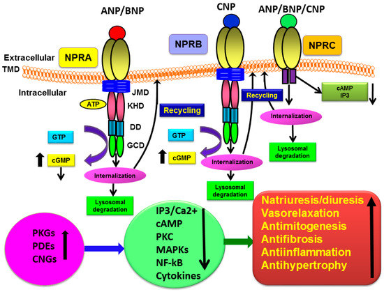 Biochemical, immunohistochemical, and molecular studies have suggested that ANP, BNP, CNP and their three distinct receptor subtypes (NPRA, NPRB, and NPRC) have widespread tissue and cellular distributions, indicating the occurrence of pleotropic actions at both systemic and local levels (Figure 1). Both ANP and BNP activate NPRA, which produces second-messenger cGMP in response to hormone binding. CNP activates NPRB, which also generates cGMP, but all three NPs indiscriminately bind to NPRC, which lacks a GC domain and does not produce cGMP [29,30,31]. The ligand–receptor complexes of NPRA, NPRB, and NPRC are rapidly internalized in the intracellular compartments and a majority of ligand-bound receptors are degraded in the lysosomes; however, a small population of receptors recycle back to the plasma membrane [6,32,33,34,35,36].The combined cellular, biochemical, molecular, and pharmacological aspects of NPs and their prototype cognate receptors have demonstrated hallmark physiological and pathophysiological effects, including renal, cardiovascular, neuronal, and immunological effects that are important in health and disease [6,9,10,23,37,38,39].