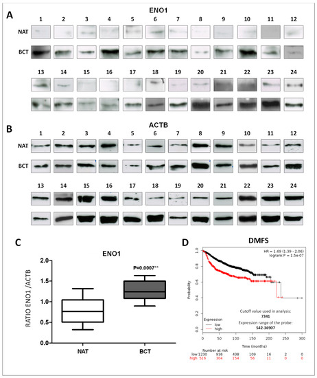 ENO1 expression between normal and breast cancer tissues and prognostic significance. (A,B) Western blot analysis of ENO1 and actin beta (ACTB) using total lysates from breast tumors (BCT) and paired non-tumoral adjacent tissues (NAT); n = 24. (C) Graphic quantification of western blot results. Each data point is the average of three independent experiments. Error bars represent the standard deviation and the p value indicates statistical significance. (D) Survival analysis in breast cancer patients obtained from the Kaplain–Meir plotter database relative to ENO1 mRNA expression.