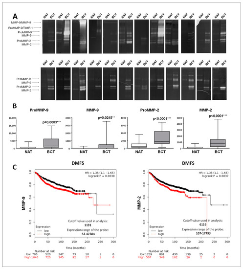 The proteolytic degradation of the ECM operated by MMPs represent a key aspect of tumor progression, since ECM is the first barrier against cell invasion. Therefore, in the same subset of 24 patients, the enzymatic activities of MMP-2 and MMP-9 were also evaluated by zymography. As shown in Figure 2A, the majority of the breast cancer tissues were positive for the lytic activities corresponding to the latent and activated form of MMP-2 and MMP-9. On the contrary, the non-tumoral counterparts were generally positive only for the latent form of MMP-2 and MMP-9. Further, lytic bands of high molecular weight, corresponding to the homodimeric forms of MMP-9 and complexes of pro-MMP-9/TIMP-1, respectively, also occurred in some patients, as already reported [21,22]. The densitometric quantification of the activity levels was performed as relative volumes, calculated as an area X optical density, using ImageJ software. As shown in the graphs (Figure 2B), the activity levels of pro-MMP-2, MMP-2, pro-MMP-9, and MMP-9 were significantly higher in the tumoral tissues, as compared to the non-tumoral adjacent tissues. Overexpression of MMP-2 and MMP-9 mRNA were also correlated with poor outcome as evaluated by distant metastasis free survival (DMFS) in the Kaplan–Meier plotter database (Figure 2C). Collectively, these results suggest that MMPs are overexpressed in breast cancer tissues, and the upregulated MMP-9 and MMP-2 mRNAs are correlated with a worse prognosis.