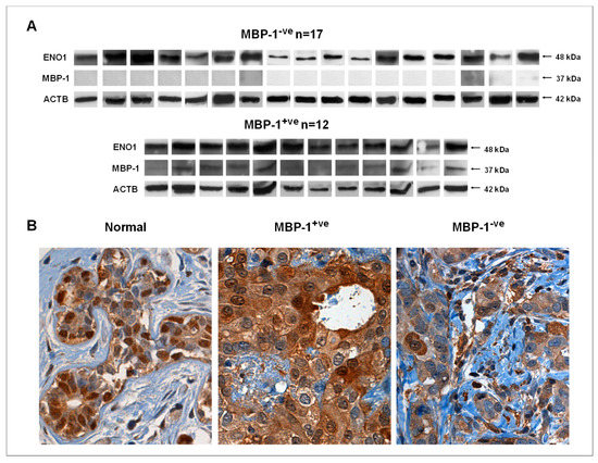 The concomitant expression of ENO1 (48 kDa) and MBP-1 variant (37 kDa) was evaluated in a cohort of 29 breast cancer tissues. Protein loading was ascertained by ACTB expression. Among the analyzed patients, 12 were positive for MBP-1 expression while 17 were negative (Figure 3A). Moreover, in all cases, the expression levels of ENO1 are higher than MBP-1. Western blot analysis results were also validated by immunohistochemistry by using the monoclonal antibody Eno 19/8 which recognizes an epitope within the aminoacids residues 275-344 [23,24]. As previously reported, cytoplasmatic staining is due to the ENO1 expression, while nuclear staining depends on the MBP-1 expression. A panel of representative immunohistochemical (IHC) staining images of MBP-1 in normal mammary and breast cancer tissues (both positive and negative) were shown in Figure 3B. IHC analysis revealed a strong MBP-1 staining in nuclei of healthy mammary tissues, while in breast cancer tissues only the selected samples showed the nuclear staining. In all cases, cytoplasmic staining correspond to ENO1 (48 kDa) expression. According to the western blot and immunohistochemical analyses on MBP-1 expression, breast tumors were classified as MBP-1−ve and MBP-1+ve.