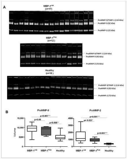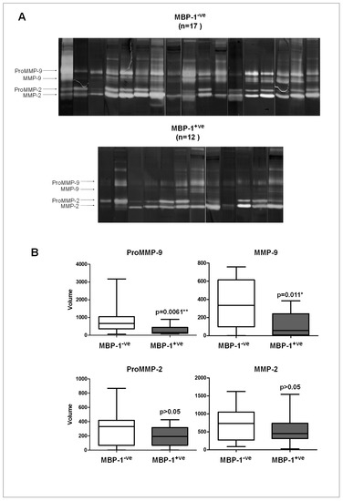 Following this, to evaluate if the MMPs activity levels could be also affected in sera samples of breast patients previously stratified as MBP-1-ve and MBP-1+ve, the zympgraphic analysis on sera samples collected before surgery was performed. Sera samples (n = 16) of healthy donors were used as control specimens. In all the analyzed sera, only the enzymatic activity of ProMMP-9 and ProMMP-2 was detected, while no enzymatic activity was detected for the activated forms (Figure 5A). Densitometric analysis of the lytic bands showed that the activity values of pro-MMP-2 were significantly higher in MBP-1-ve breast cancer sera compared to MBP-1+ve and healthy sera (Figure 5B). No statistical differences were found among the three groups for ProMMP-9 activity.