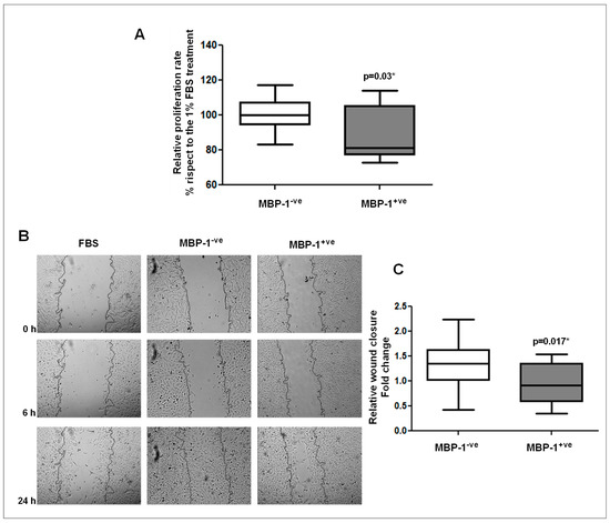 To establish if the sera of MBP-1-ve and MBP-1+ve breast tumors were able to affect cell growth and migration, the MDA-MB-231 cells were used as prototype of highly proliferative and metastatic tumor model. Cell proliferation was evaluated by MTT assay after 24 h of treatment with 1% sera from MBP-1-ve or MBP-1+ve breast cancer patients, compared to 1% Foetal Bovin Serum (FBS) treatment. The treatment with MBP-1+ve breast sera reduced significantly cell proliferation rate, although a high heterogeneity was recorded with some sera (Figure 6A). The effect of MBP-1-ve and MBP-1+ve breast sera on MDA-MB-231 cell motility was also evaluated by in vitro wound healing assay. As shown in Figure 6B, the migratory capability of MDA-MB-231 cells treated with MBP-1-ve sera was considerably increased compared to the FBS treatment. Interestingly, the enhanced migration induced by MBP-1−ve sera was diminished in MDA-MB-231 cells treated with MBP-1+ve sera (Figure 6B,C). In summary, the obtained results suggest that MBP-1+ve tumors are less aggressive than MBP-1-ve tumors.