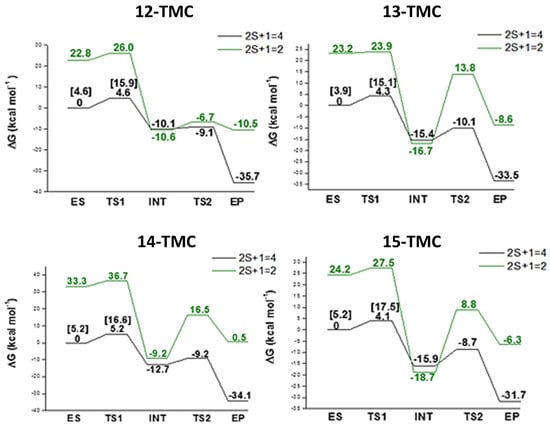 As mentioned before, the quartet PESs wind below the doublet ones, but spin crossing at the first intermediate (INT) level are present on the PES describing the catalytic activity of complexes with 12-TMC, 13-TMC and 15-TMC. However, the energy values of intermediate in the two different multiplicities are very similar, therefore the inter-surface crossings should not introduce significant effects in the energetic behaviors.