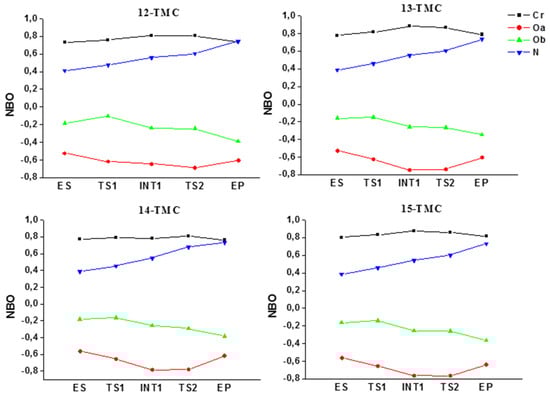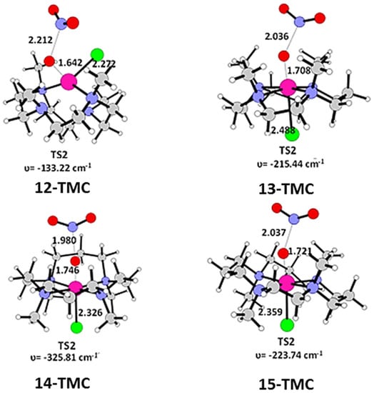IRC computations clearly indicated that this transition state connects the ES with the intermediate INT. As it can be seen from Figure 2, the energy amount necessary to convert ES into INT is considerably small: 4.6 (12-TMC), 4.3 (13-TMC), 5.2 (14-TMC), and 4.1 (15-TMC) kcal mol−1. This means that with these activation energies (TS1), the first reaction step results to be very fast at laboratory temperature.