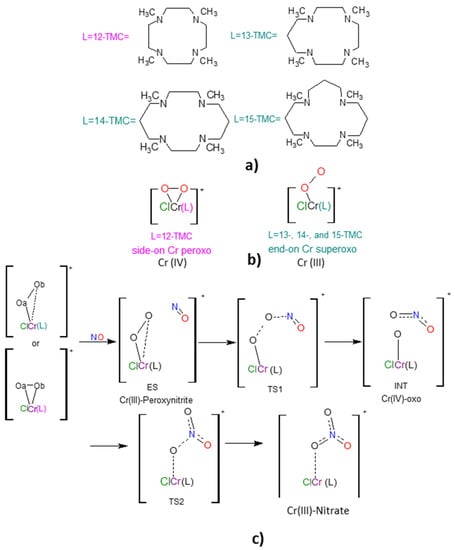 Based on what has been said, our computation can support the possibility to isolate the Cr(III)-nitrate (EP) species for the reactions catalyzed by [Cr(III)(13-TMC)(O2)(Cl)]+ and mainly [Cr(III)(15-TMC)(O2)(Cl)]+ since the barriers result to be the highest in the studied series (5.3 or 6.8 kcal mol−1 and 7.2 or 10.0 kcal mol−1, respectively). We hope that these results could stimulate future desirable experiments on the reactivity of chromium containing 13 and 15-TMC ligands.