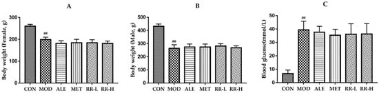 2.1. Effects of RR on the Body Weight and Levels of Random Blood Glucose in Diabetics Rats