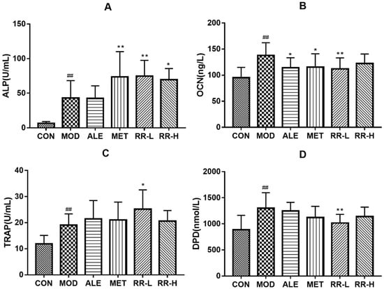 2.2. RR Regulates Biochemical Parameters Related to Bone Formation in Diabetic Rats