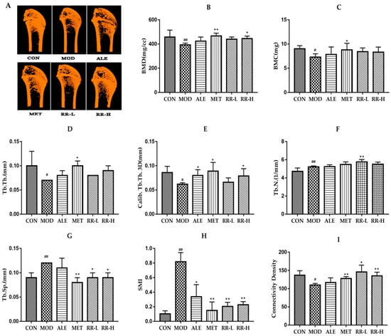 2.3. RR Enhances Bone Mineral Density and Improves the Bone Microarchitecture in Diabetic Rats