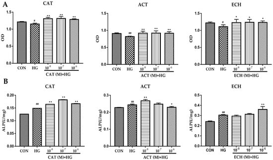 2.4. CAT, ACT, and ECH Extracted from RR Enhance the Proliferation and Differentiation of Osteoblastic MC3T3-E1 Cells Damaged by High Glucose