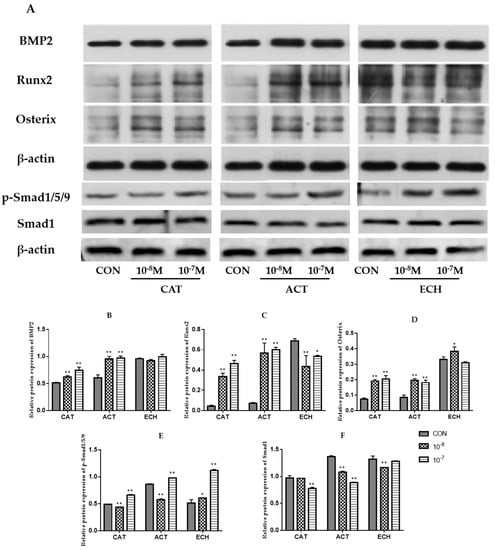 2.5. CAT, ACT, and ECH Modulate the BMP2 Pathway in Osteoblastic MC3T3-E1 Cells