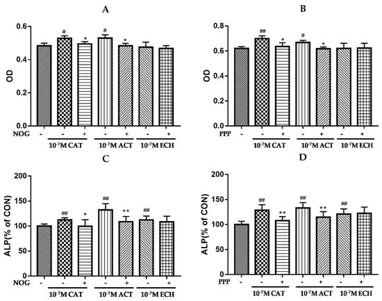 2.7. Noggin (NOG) and Picropodophyllin (PPP) Counteract the Effects of CAT, ACT, and ECH in MC3T3-E1 Cells