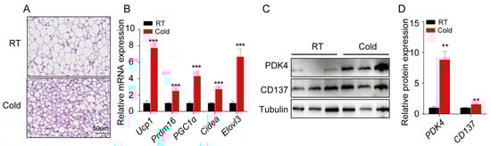 To explore whether acute cold stimulation (4 °C for 4 h) would induce formation of beige fat, H&E staining of sWAT from two groups of mice were conducted. Our data showed a smaller average adipocyte diameter in the cold-stimulated mice (Figure 1A). Next, we determined the changes in the expression of brown and beige adipocyte marker genes (Ucp1, Prdm16, Pgc1a, Cidea, and Elovl3). The RNA levels of these marker genes were significantly elevated in response to cold stimulation (Figure 1B). An increase of the beige adipocyte marker, CD137, and the brown adipocyte marker, PDK4, was observed in cold-treated sWAT at the protein level (Figure 1C); further confirming that sWAT browning occurred in cold-stimulated mice. The quantitative data from immunoblots are shown in Figure 1D. Collectively, our data showed that acute cold stimulation induced the formation of beige adipocytes in mouse sWAT.