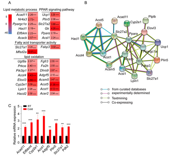 Acute cold exposure significantly alters the expression of genes involved in fatty acid metabolic processes and lipid oxidation. (A) Based on the RNA-sequencing data, the heat map was constructed from a panel of 31 upregulated genes, which were annotated in the GO terms lipid metabolic process, fatty acid metabolic process, lipid oxidation, fatty acid oxidation, and PPAR signaling pathway. * p < 0.05, ** p < 0.01 and *** p < 0.001 for differences between control and cold treatment groups. (B) Thirty-one genes were used to build the molecular network. (C) QPCR validation of randomly selected DEGs. ** p < 0.01 and *** p < 0.001 for differences between control and cold treatment groups.
