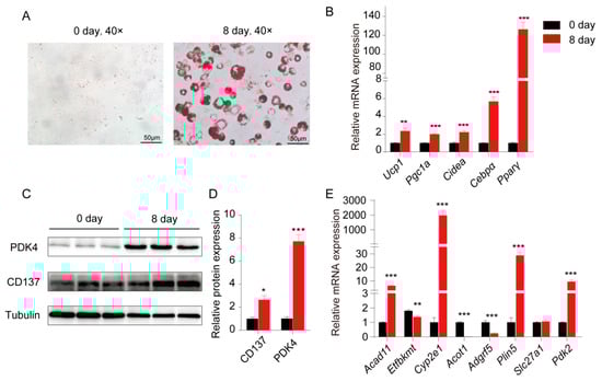 Gene expression was induced in 3T3-L1 cells during differentiation into beige adipocytes. (A) Oil Red O staining of 3T3-L1 cells undergoing beige adipogenic differentiation on days 0 and 8. (B) The relative mRNA expression of brown/beige adipocyte marker genes (Ucp1, Pgc1a, and Cidea) and adipogenic marker genes (Cebpα and Pparγ). (C) Immunoblot analysis of brown/ beige adipocyte marker proteins (PDK4 and CD137) in 3T3-L1 cells before and after differentiation, one representative blot from 3 independent experiments is shown. (D) Quantitative protein levels of PDK4 and CD137 from immunoblot. (E) The relative mRNA expression of genes in 3T3-L1 cells undergoing beige adipogenic differentiation on days 0 and 8. Results represent the mean ± SEM, * p < 0.05, ** p < 0.01 and ** p < 0.001 for differences between 3T3-L1 differentiation on 0 day and 8 day.