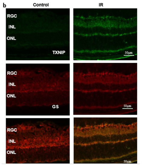 IR injury-induced Müller cell activation was assessed by intense radial staining of glial fibrillary acidic protein (GFAP) when compared to sham controls after 3 days (Figure 2a). Müller cell activation remained, although to a lesser extent after 14 days, which signifies the importance of the glial activation in response to a transient ischemic event. Next, we examined the expression of TXNIP in retina sections. As shown in Figure 2b, IR injury triggered TXNIP expression compared to shams. TXNIP (green) was markedly co-localized (yellow) within Müller cells stained with glutamine synthetase (GS, red) in retinas from IR mice when compared to retinas from sham mice.