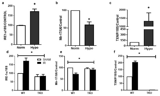 To better understand the specific role of glia in ER stress-mediated miR-17-5p and TXNIP regulation, rat Müller cells (rMC-1) were used. To mimic IR-injury, rMC-1 cells were exposed to hypoxia for 1 h, followed by reperfusion in normoxia for 24 h. Exposure to transient hypoxia, followed by reoxygenation, significantly upregulated (~2-fold) the ER stress marker inositol-requiring enzyme-1-alpha (IRE-1α) mRNA expression when compared to normoxia (Figure 3a). This effect coincided with significant decreases in expression of miR-17-5p (Figure 3b) and significant increases (20-fold) in TXNIP mRNA (Figure 3c) in response to hypoxia, compared to cells grown in normoxia.