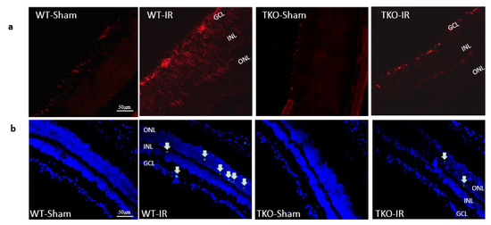 (a) Ischemia/Reperfusion (IR) induced strong activation of Muller cells, the main glia in the retina, assessed by GFAP radial staining after 3-days in WT-IR but not in TKO-IR when compared to shams. (b) Ischemia/Reperfusion (IR) sustained retinal cell death indicated by TUNEL-positive cells (arrows) after 3-days in WT-IR, but not in TKO-IR when compared to shams.