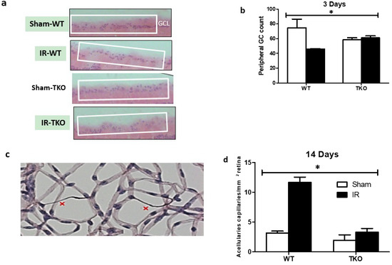 (a,b) Representative images and statistical analysis showing IR caused significant reduction in total number of cells in ganglion cell layer (GCL) in the peripheral retinas of the WT, but not of TKO mice when compared to shams after 3-days. (c,d) Representative image and statistical analysis showing IR significantly increased development of occluded (acellular) capillaries in WT, but not TKO mice when compared to shams after 14-days. (n = 8–10, * p < two way ANOVA showed disease and gene interaction, * p < 0.05).