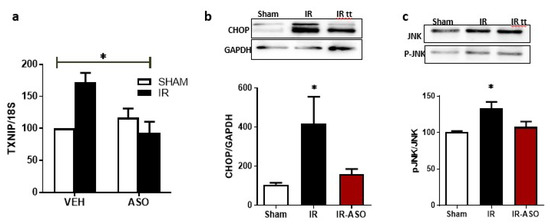 WT mice were subjected to ocular ischemia, and after 48 h the mice were randomly assigned to receive TXNIP antisense oligomer (ASO) or scrambled oligomers via intravitreal injection. Mice were sacrificed after 14 days of the IR injury. First, we confirmed that ASO, a novel specific TXNIP inhibitor, blunted the increase of TXNIP mRNA after retinal IR (Figure 7a). Of note, ASO-WT tended to show a higher level of TXNIP mRNA when compared to Scr-WT; however, it did not reach statistical significance. Next, we examined the impact of TXNIP-ASO on the expression of the ER stress marker C/EBP homologous protein (CHOP). As shown in Figure 7b, western blot analysis showed that TXNIP-ASO blunted the increase in CHOP expression after retinal IR. As shown in Figure 7c, transient ocular ischemia triggered the phosphorylation of the apoptotic marker JNK when compared to shams. Interventional treatment with TXNIP-ASO significantly reduced JNK phosphorylation after retinal IR in WT.