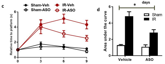 (a,b) Representative image and statistical analysis showing that transient ischemia increased number of acellular capillaries (marked with x), which was reduced by inhibiting TXNIP expression 2 days after IR. (c,d) I/R led to an increase in escape time, inhibiting TXNIP reduced the time to reach the platform 6 and 9 days after injury. (n = 8–10, two-way ANOVA showed significant disease and treatment interaction, * p < 0.05 ASO vs. IR vehicle).