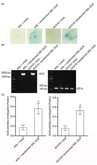 - Díaz, T.P.; Bernal, G.A.; Camilo, L.C. Transient gus gene expression in cassava (manihot esculenta crantz) using agrobacterium tumefaciens leaf infiltration. Revista. Mvz. Cordoba 2014, 19, 4338–4349. [Google Scholar]