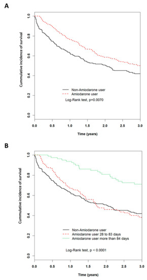 Cumulative incidence of survival in patients with hepatoma with the presence and absence of amiodarone by Kaplan–Meier method analysis. (A) 3-year Kaplan–Meier survival curves for amiodarone and non-amiodarone users. (B) 3-year Kaplan–Meier survival curves for amiodarone users of more than 84 days, 28–83 days, and non-amiodarone users.