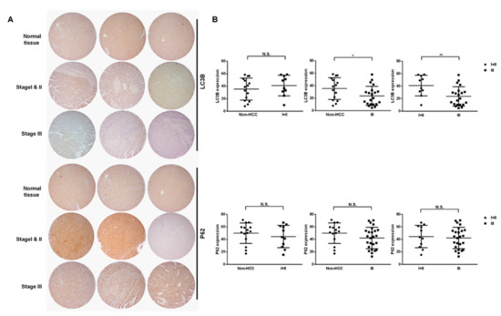 Low LC3B expression correlated positively with late stage hepatocellular carcinoma. (A) The expression levels of LC3B and P62 in stages I + II (n = 10) and III (n = 21) of tumor tissues and adjacent tissues (n = 15) were detected by IHC. (B) Means of the measurements are shown with black lines. (NS: non-significant difference, * p < 0.05, ** p < 0.01 compared with untreated normal tissues).