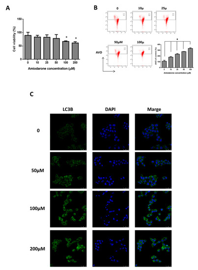 Amiodarone inhibited HepG2 cell growth through autophagy. (A) MTT assay for cell viability of HepG2 cells treated with various concentrations of amiodarone for 24 h. (B) Quantification of AVO formation in HepG2 cells. AVO induction was measured by acridine orange staining and the percentage of developed AVOs was analyzed by flow cytometry. LC3B puncta formation in HepG2 cells under (C) confocal microscope was examined. HepG2 cells were treated with various concentrations of amiodarone, as indicated, and subjected to immunofluorescence analysis of LC3B. Nuclei were stained with DAPI. The results are expressed as the means ± SD from three independent experiments (n ≧ 3, * p < 0.05 compared with untreated control).