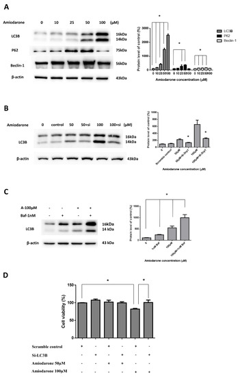 HepG2 and CRL 1439 cells cultured with or without amiodarone were harvested and total cell protein was extracted using whole cell lysis buffer. The protein concentrations were determined by the Bradford method (Bio-Rad, Berkeley, CA, USA). Samples with equal amounts of protein were subjected to 8–15% sodium dodecyl sulfate polyacrylamide gel electrophoresis (SDS-PAGE) and transferred onto a polyvinylidenedifluoride (PVDF) (Millipore, Bedford, MA, USA) membrane. The membrane was incubated at room temperature in blocking solution (5% nonfat milk) for 1 h followed by incubation for 2 h in blocking solution containing an appropriate dilution of anti-LC3B, -P62, -Beclin-1 antibody (Cell Signaling Technology, Danvers, Massachusetts, USA). After washing, blots were then probed with appropriate secondary horseradish peroxidase (HRP)-conjugated secondary antibodies (Jackson ImmunoResearch, West Grove, PA, USA), detected by an ECL detection system (Millipore, Burlington, Massachusetts, USA), and scanned by MultiGel-21 (Top Bio, Taipei, Taiwan). β-actin was indicated as an internal control.