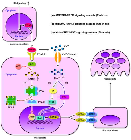 - Park, H.J.; Baek, K.; Baek, J.H.; Kim, H.R. The cooperation of CREB and NFAT is required for PTHrP-induced RANKL expression in mouse osteoblastic cells. J. Cell Physiol. 2015, 230, 667–679. [Google Scholar] [CrossRef]