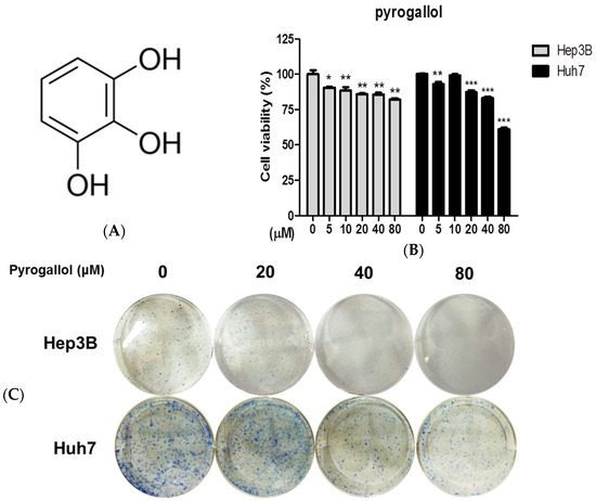 Pyrogallol decreased the viability of Hep3B and Huh7 cells. (A) Chemical structure of Pyrogallol. (B) Cells were seeded in a 96-well plate and exposed to various concentrations of Pyrogallol (0, 5, 10, 20, 40, 80 μM) for 24 h and cell viability was determined by MTT assay. (C) Photos for colony formation of Pyrogallol (0, 5, 10, 20, 40, 80 μM) in Hep3B and Huh7 cells. The colonies were visualized by staining with crystal violet. Data are expressed as means ± SD. * p < 0.05, ** p < 0.01, *** p < 0.001.