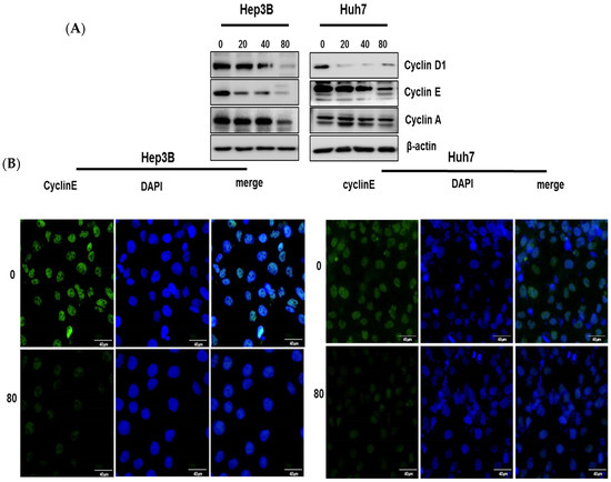 Cell cycle analysis revealed that Pyrogallol induced S-phase arrest in Hep3B and Huh7 cells. Consistently, Pyrogallol attenuated the protein expression of Cyclin D1, Cyclin E, and Cyclin A (Figure 3A) and also reduced the fluorescent expression of Cyclin E in Hep3B and Huh7 cells (Figure 3B).