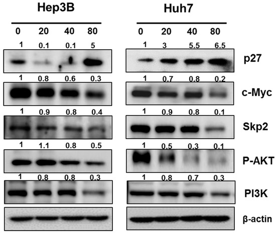 2.4. Pyrogallol Decreased the Expression of c-Myc, Skp2, p-AKT, PI3K and Increased the expression of p27 in Hep3B and Huh7 Cells