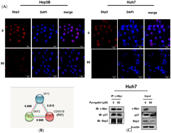 To check the effect of Pyrogallol on Skp2, immunofluorescence was conducted in Hep3B and Huh7 cells. Here Pyrogallol decreased the expression of Skp2 in Hep3B and Huh7 cells (Figure 5A). To confirm the direct binding between Skp2, p27, and c-Myc, since the binding score between Skp2 and p27, p27 and c-Myc, Skp2 and c-Myc was 9, 9, and 8, respectively by the STRING database (Figure 5B), the immunuoprecipitation assay was conducted in Hep3B and Huh7 cells. Immunoprecipitation confirmed that the interaction between Skp2, p27, and c-Myc was disturbed by Pyrogallol in Huh7 cells (Figure 5C).