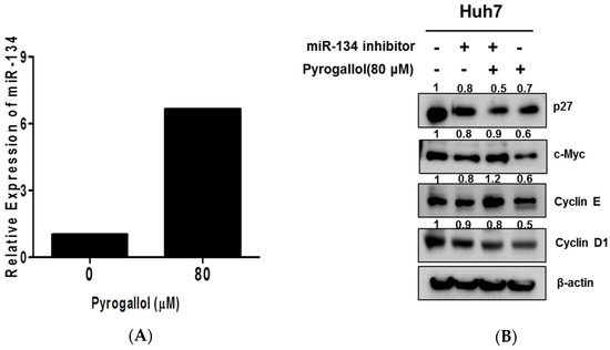 It is well documented that miR-134 was highly expressed in lung tumor, pancreatic cancer, colon cancer, and prostate cancer while it was minimally expressed in glioblastomas, breast cancer, renal cell carcinoma, colorectal cancer, hepatocellular carcinoma, and osteosarcoma cell lines [30]. To demonstrate the important role of miR-134 in Pyrogallol-treated Huh7 cells, RT-qPCR analysis was performed in Huh7 cells. The mRNA level of miR-134 was significantly induced by Pyrogallol in Huh7 cells (Figure 6A). However, miR-134 inhibition rescued the decreased expression levels of c-Myc, Cyclin E, and Cyclin D1 and increased the expression of p27 by Pyrogallol in Huh7 cells (Figure 6B).
